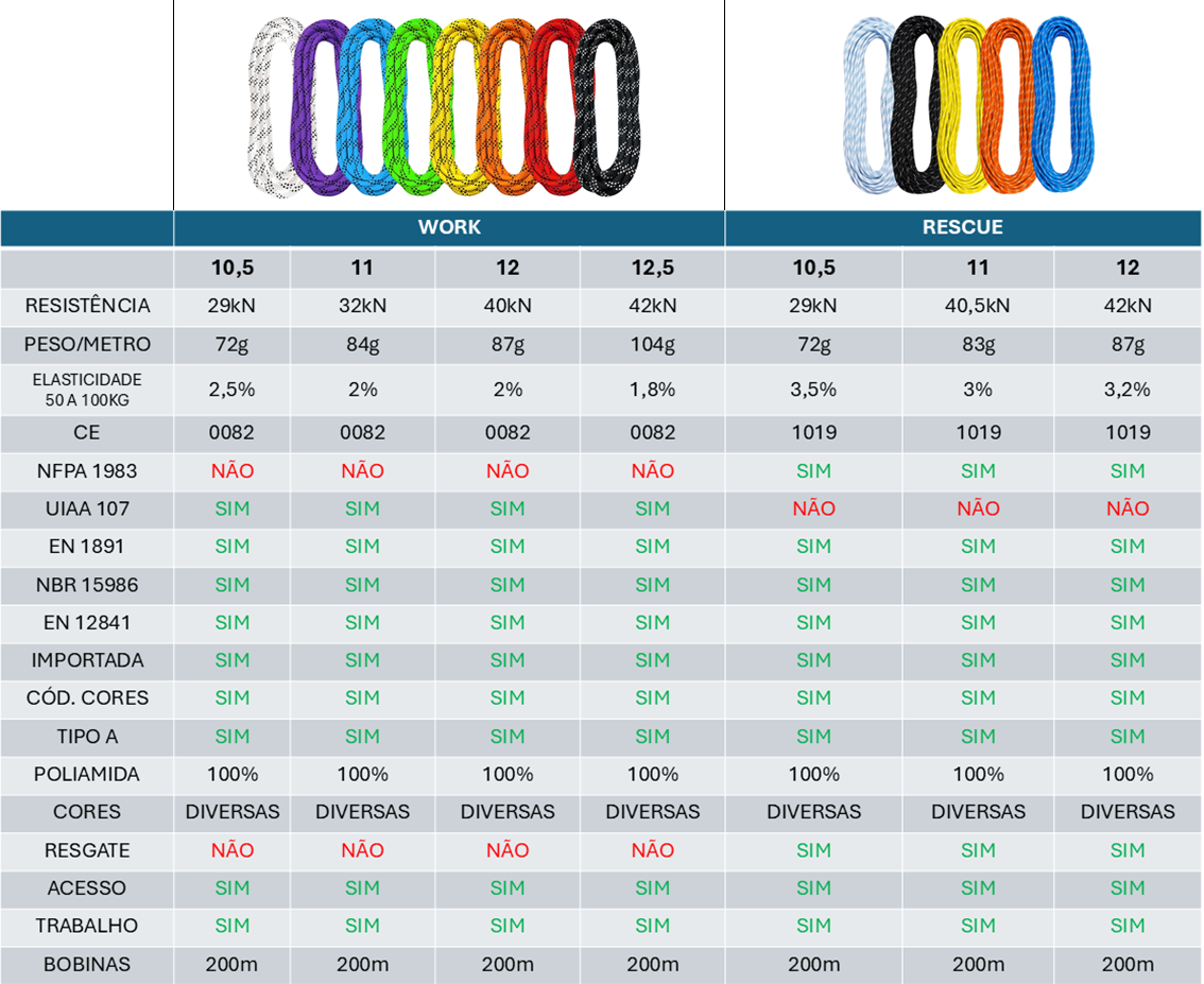 Certificações nacionais e internacionais CE 0082, EN 1891, NBR 15986 e UIAA 107. Certificação EN 1891, cumpre a EN 12841 (trava-quedas, descensores manuais e bloqueadores), conforme manual dos fabricantes.