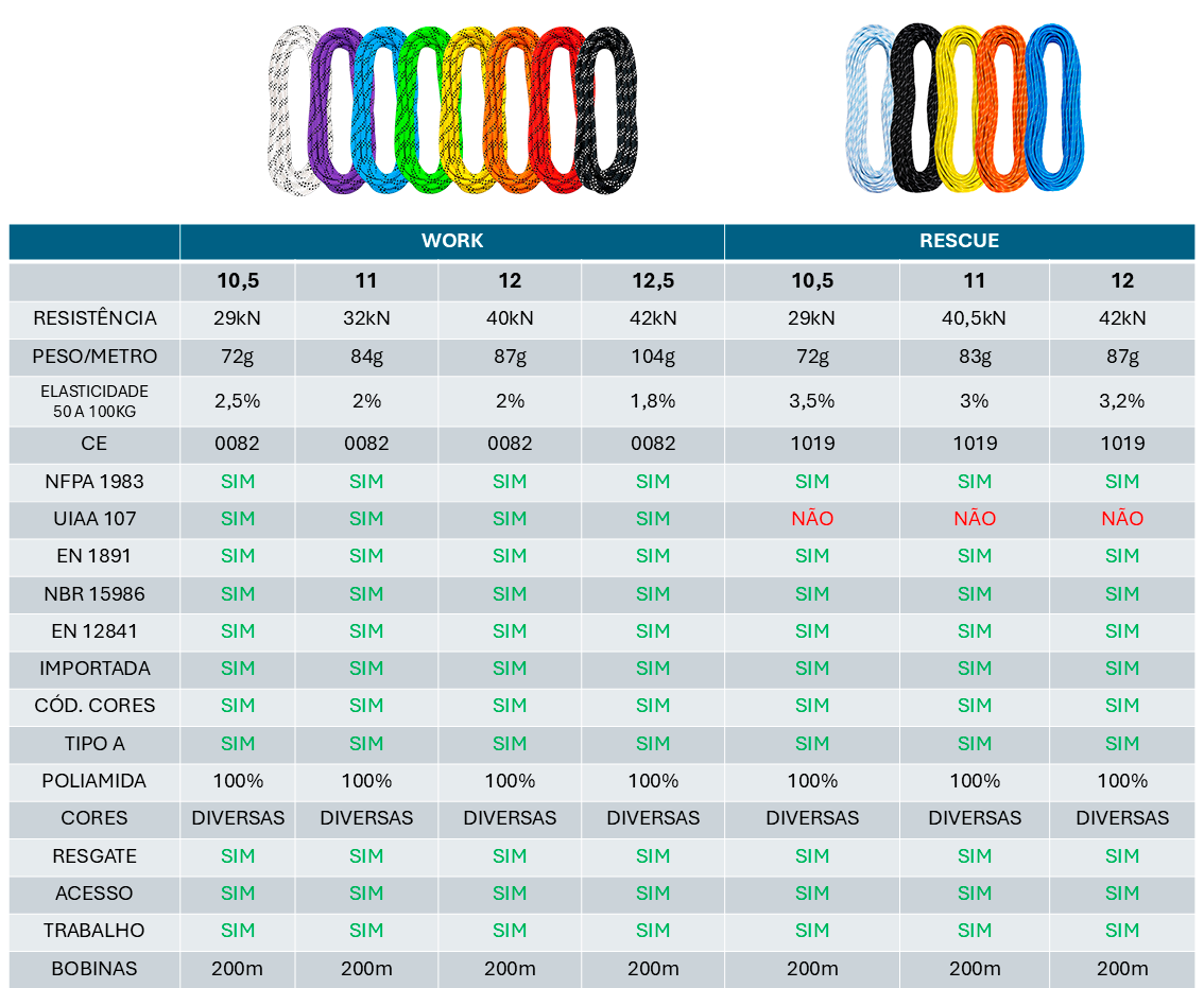 Construída em materiais importados, nobre e resistente. Melhor custo-benefício (desgaste x certificação x segurança x preço). Sua composição é 100% em poliamida. A capa é trançada com seu núcleo torcido, melhorando assim atributos como abrasão, resistência, absorção e elasticidade.