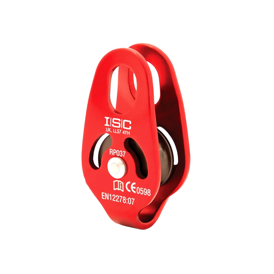 A Micro Polia ISC RP037 foi criada com funcionalidade e versatilidade. Ela possui um olhal de fixação revisado que é mais largo e longo, permitindo uma maior compatibilidade com mosquetões e até mesmo permitindo rotação com muitos modelos. Dimensões do olhal: 2,2cm x 1,6cm. A polia utiliza alumínio da série 6000 e uma roda anodizada para oferecer a resistência e qualidade que você espera de qualquer produto ISC.